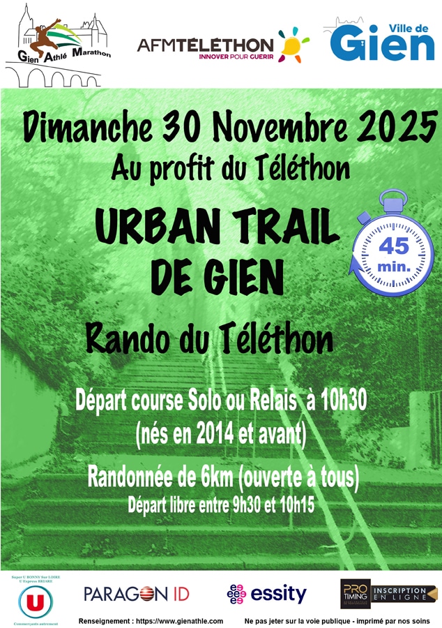 UBAN TRAIL DE GIEN est un trail urbain d’une boucle de 2 km à faire en le plus de fois possible en un temps impartie de 45’ pour la catégorie de Cadets à Masters.